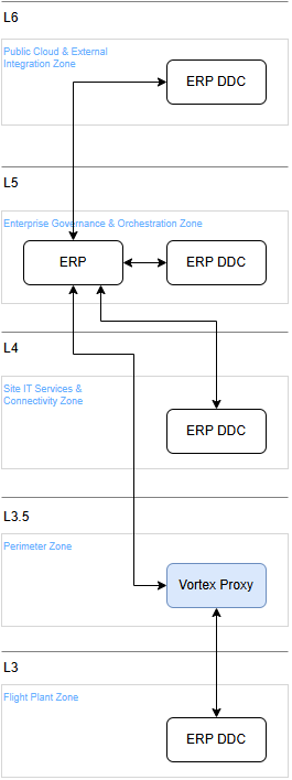 The ERP Highway is a dedicated integration corridor designed for the synchronization of organizational Master Data and administrative schedules. Unlike the Orchestration Highway, this channel is strictly prohibited from carrying mission-critical commands or machine tasks. It relies on Data Delivery Components (DDCs), abstractions of vendor-specific integration suites (e.g., SAP Integration Suite), distributed across the Purdue levels (L6 to L3) to maintain consistency within the ERP's own domain.