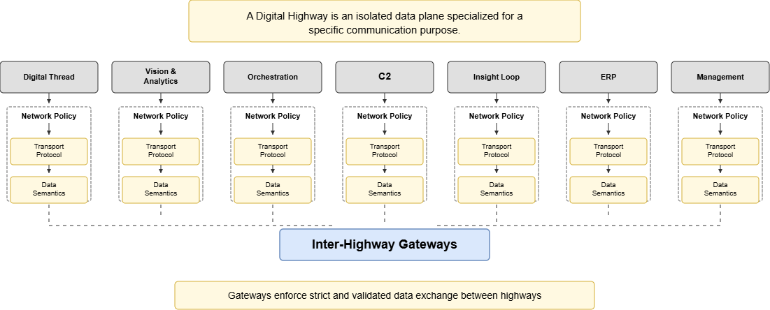A Digital Highway is a logically and physically isolated data plane within the Aero-Factory architecture, designed to transport a specific class of information with guaranteed performance, security, and behavioral characteristics.