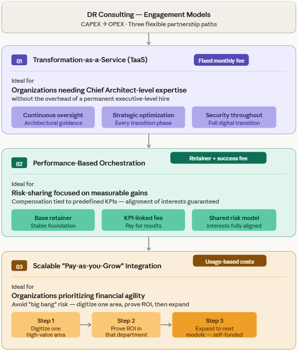 This model provides continuous architectural oversight and strategic optimization through a fixed monthly engagement, offering the client security throughout every phase of their digital transition. It is ideal for organizations requiring "Chief Architect" level expertise without the high overhead of a permanent executive-level hire.